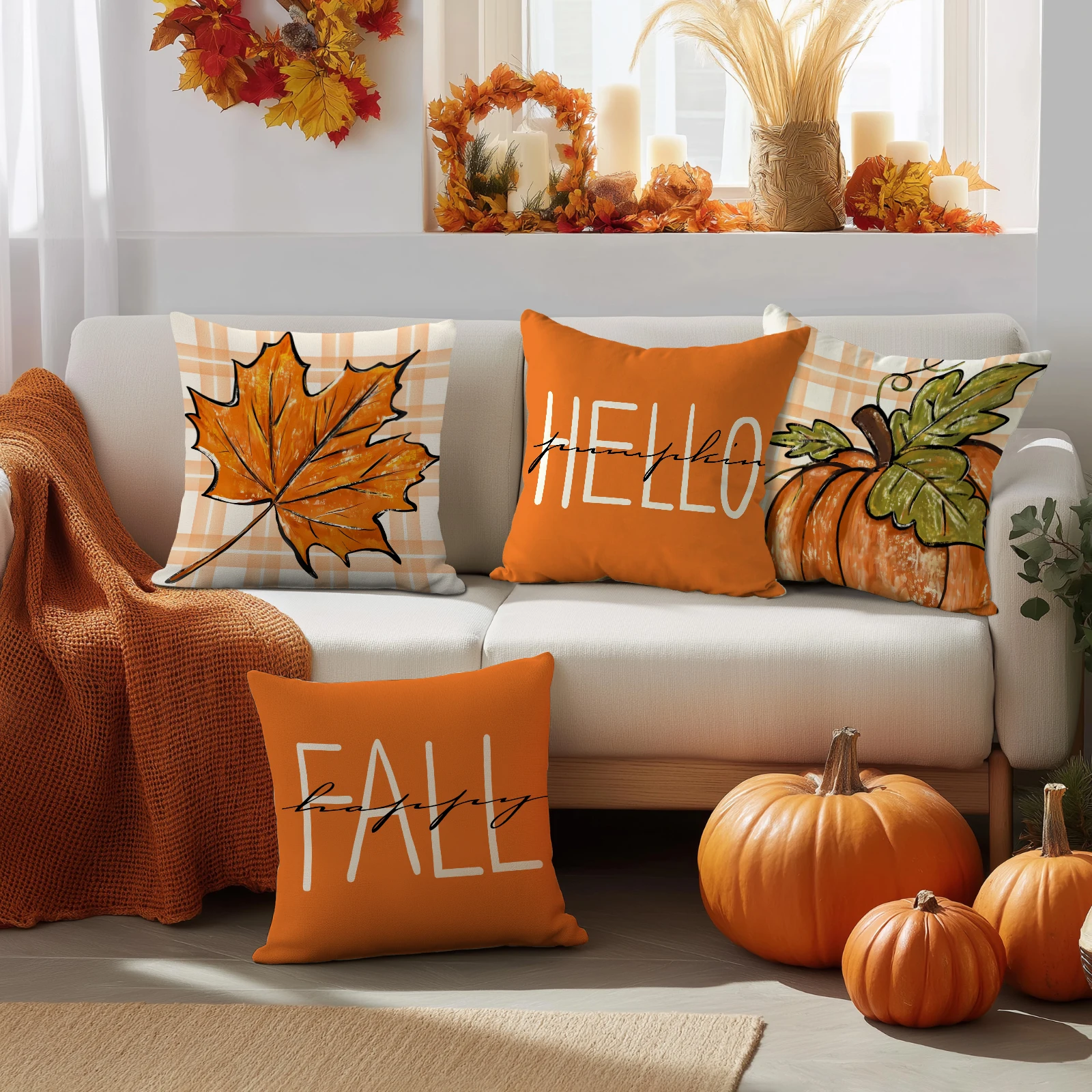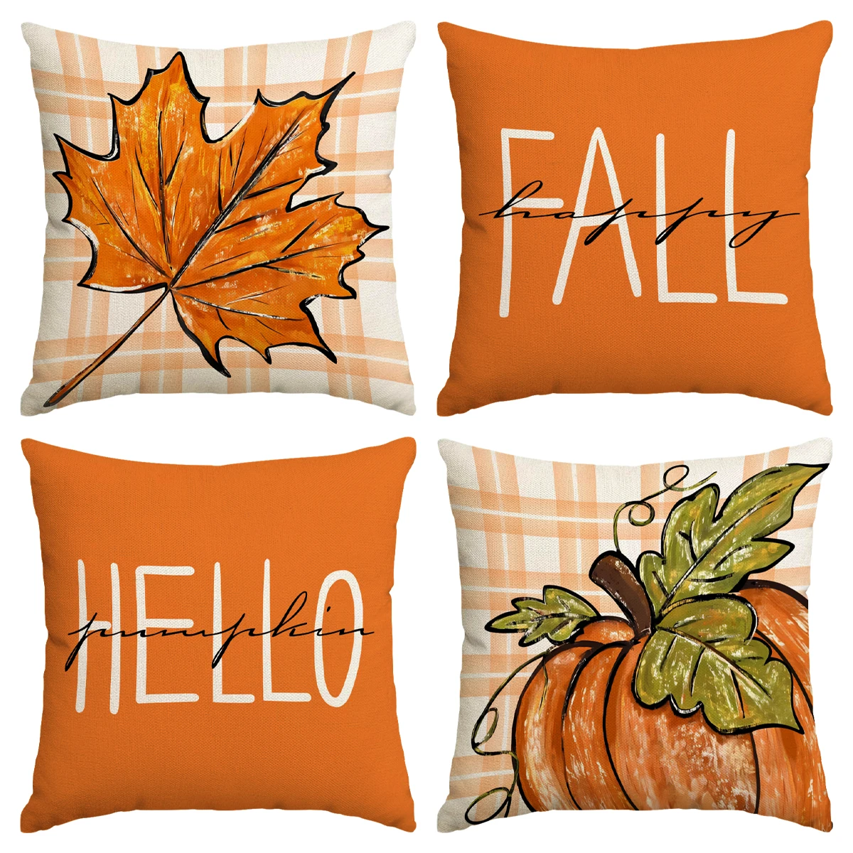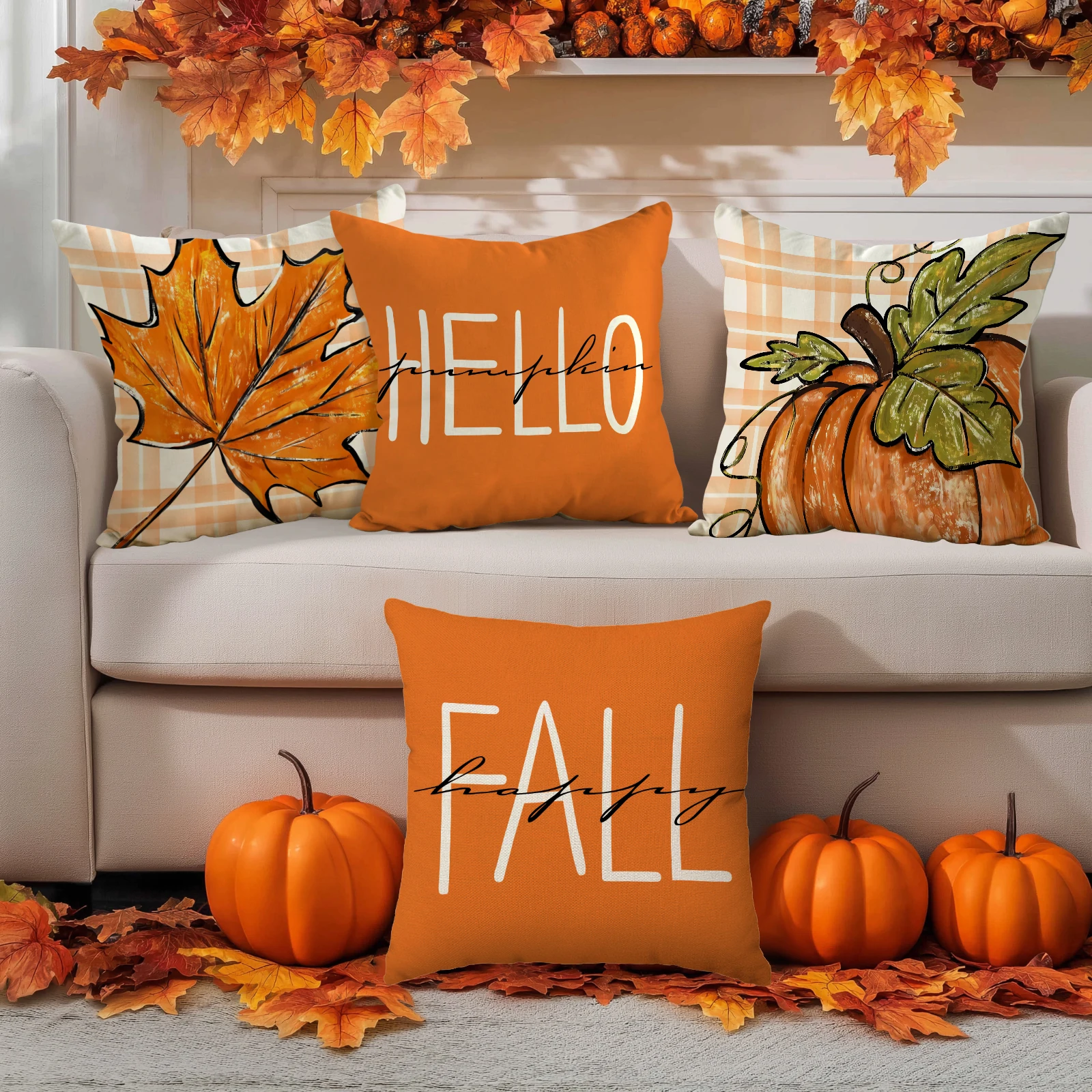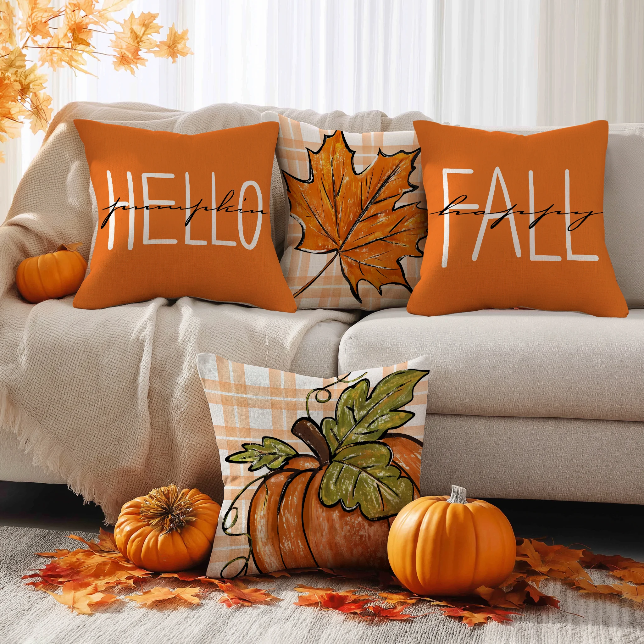 4pcs Thanksgiving Pillow Cover, Pumpkin, Maple Leaf, Stripe Pattern Cushion Cover, Hello Autumn Home Decoration Pillowcase